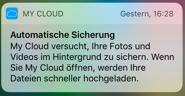 Sie wollten auch wissen, ob die My Cloud App die Sicherung dann machen wird, wenn die nicht auf ist oder läuft nicht in Hintergrund. Für die Sicherung auf die My Cloud soll die App im Hintergrund laufen. Das ist si bei der My Cloud App, weil die auf dem iPhone eine Drittanbieter App. Die iCloud ist eine App von Apple und die kommt mit dem iOS Betriebssystem und wird für die Sicherung automatisch beim iPhone angeboten.