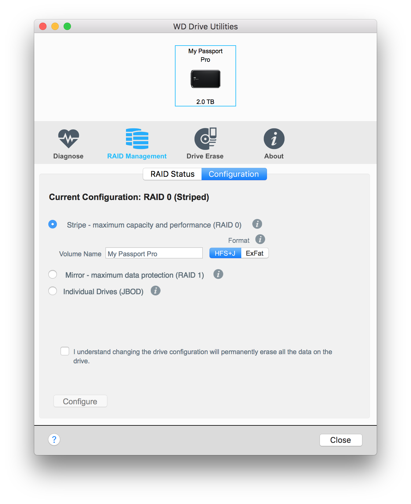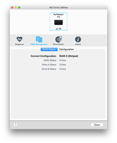 - i’ve got a new “My Passport Pro (2TB)” thunderbolt drive configured however it came (i’ve not changed its formatting or anything).