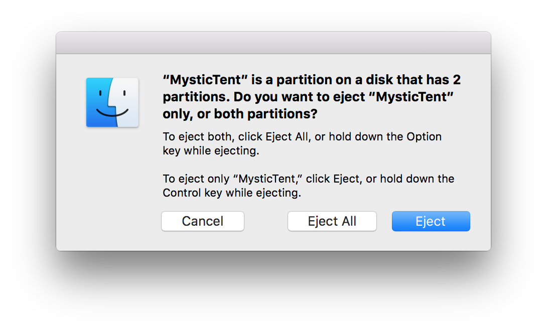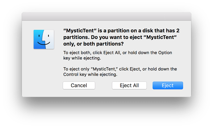 [myDrive] is a partition on a disk that has 2 partitions. Do you want to eject [myDrive] only, or both partitions?