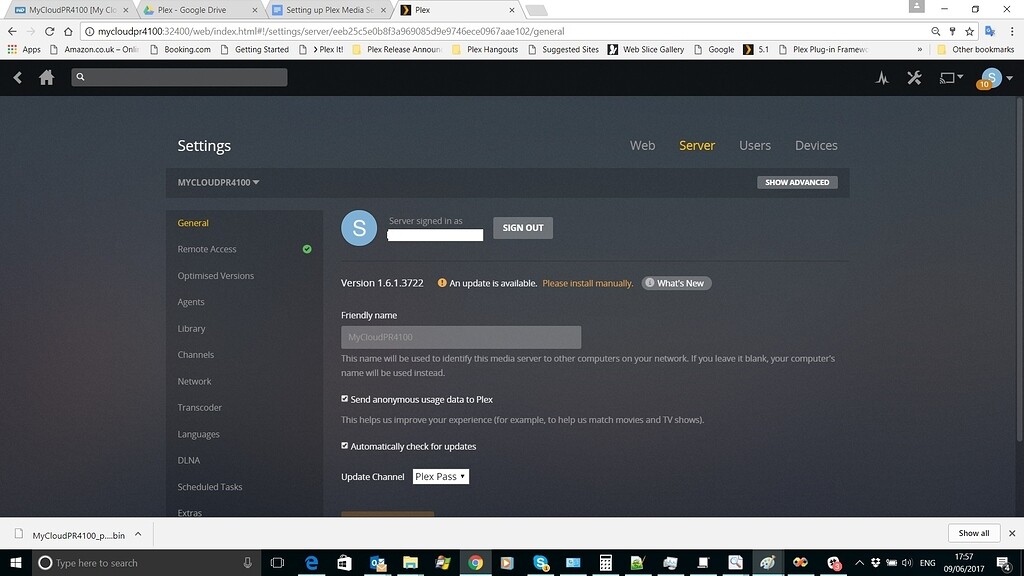 I installed the plex app through the admin of the network drive, but the version is old and incompatible with any clients on my network. In the Plex admin if I go to update the software version, it says to please update manually, and in the My Cloud admin there does not appear to be a way to update the Plex version or to do it manually.