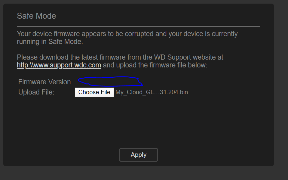 Hi everyone, I have a WD My Cloud device, 6Tb, gen 2, and I haven’t found any info about unbrick this unit in particular. I followed the procedure described at the topic “Success recover my MyCloud 3TB with fast blue blinking light after update firmware!”, but like lot’s of people, I’ve got stuck at safe mode with “Firmware Version: (BLANK)”. When I tryed to Update the firmware at this point, the progress bar started to move, but no percentage was showing. There was no progress at all. Befor…